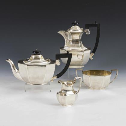 4 Teile: Kaffeekanne, Teekanne, Zuckerschale und Sahnegießer in 8-eckiger, facettierter Form mit schwarzen Knäufen und Henkeln