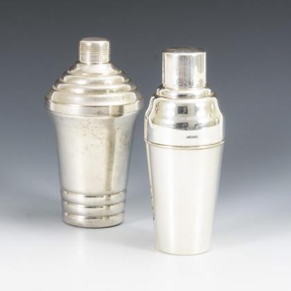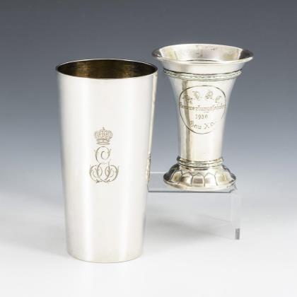 1x kleiner ADAC-Becher "Gauwertungsfahrten 1930. Gau 10a". / 1x hoher konischer Militaria-Becher des 6. Thüringischen Infanterie-Regiments mit Widmung "Oberzahlmeister Binn, 40 Dienstjahre 1. 4. 03, Offiziere III/95.", verso bekrönte Monogrammgravur Georg II. Innen vergoldet