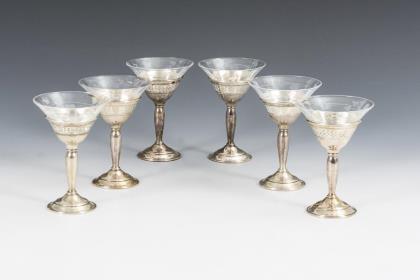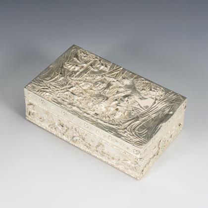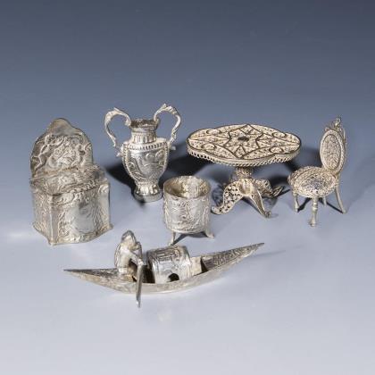 Silber, reliefiert und filigran gearbeitet. 1 Dose, 1 Amphore, 1 Fußbecher, 1 Tisch, 1 Stuhl, 1 Ruderboot. 4 Teile mit teilweise undeutlichen Punzen