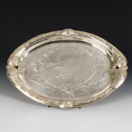 Ovales Tablett mit floral reliefiertem Rand und Lorbeerkranz-Gravur im Spiegel