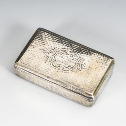 Guillochiertes Döschen mit gravierter Widmung auf dem Scharnierdeckel. Innen vergoldet
