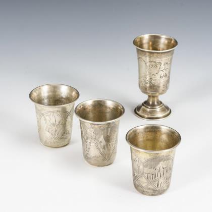 3 konische Schnapsbecher mit Architekturgravur und 1 Fußbecher mit gravierter Kartusche