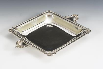 Quadratische Schale mit rocailliertem Rand und 2 blattreliefierten Handhaben