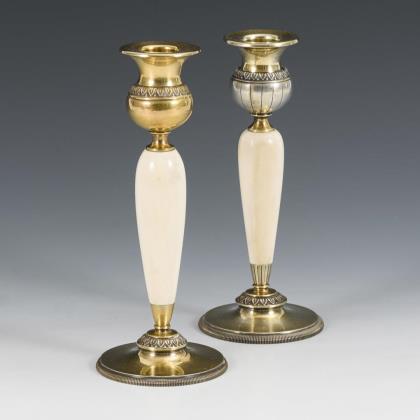 2 gilded candlesticks with ivory shafts. Koch & Bergfeld.