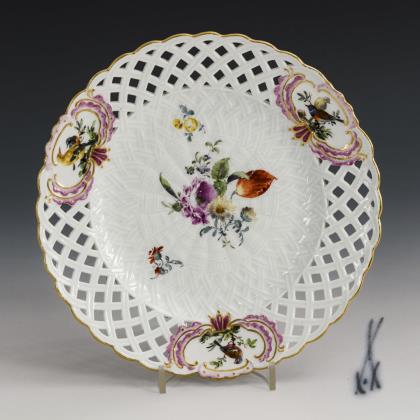 Teller mit korbdurchbrochener Fahne. Im Spiegel ein Blumenbukett, in den Rocailleschildern auf der Fahne Vogelmalerei