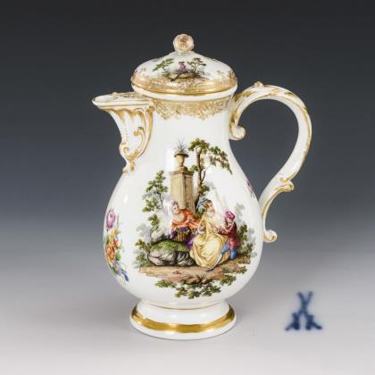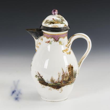 Coffee pot with painting of a merchant's journey and silver mount. Meissen.