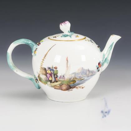 Umlaufend feine farbige Bemalung mit vier verschiedenen Hafenszenen. Beidseits große schwarz konturierte Gold-Kartuschen. Seitlich Goldspitzenbordüren. Vergoldeter Metalldeckel mit Holzkern. Unglasierter Boden, Pressmarke, Rest einer goldenen Malermarke, kaum noch erkennbare Schwertermarke