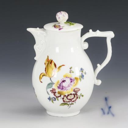 Reiche farbige Blumenbemalung mit Buketts, Einzelblüten und Festons, gold staffiert. Balusterkorpus, kleine Flachdeckel mit plastischem Blütenknauf. Henkel und Ausgüsse mit reliefierten Ansätzen. Schwertermarken