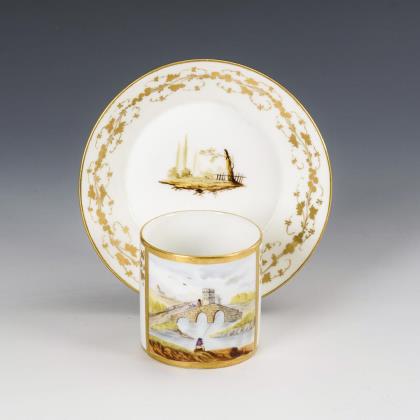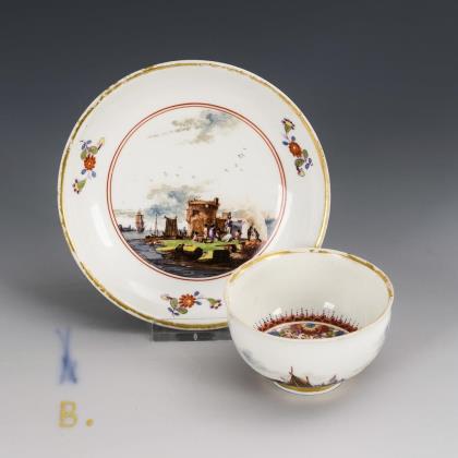 Auf Koppchen und Untertasse fein gemalte Flusslandschaften mit Architektur und Personenstaffage