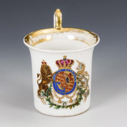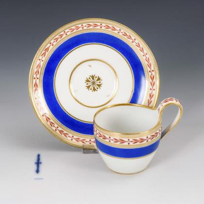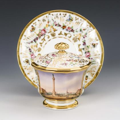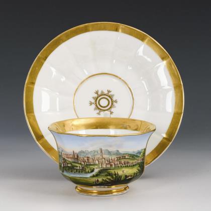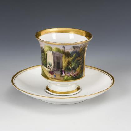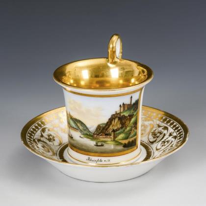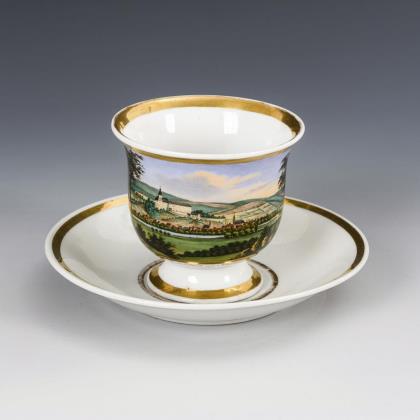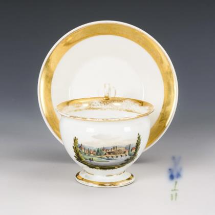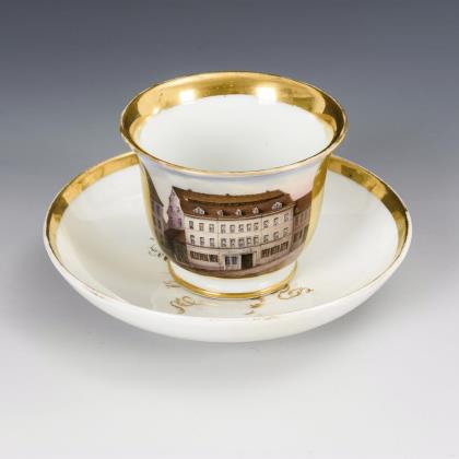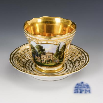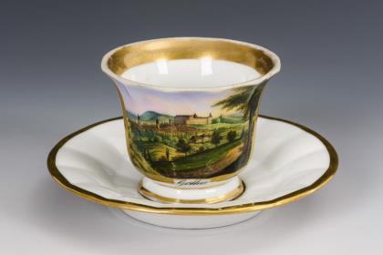 Gefußte Kratertasse mit Perlbandhenkel. Schauseitig ein Medaillon mit der sepiagemalten Ansicht eines Schlosses in einem Park, im Spiegel der Untertasse die Aufschrift "Wahlspruch / Lasset uns Ihn lieben, denn Er hat uns zuerst geliebt."