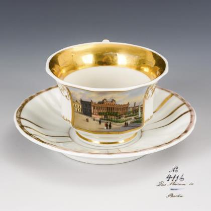 Polygonale, gefußte Glockentasse mit spitz geschweiftem Henkel. Schauseitig eine goldgerahmte Rechteckkartusche mit der Darstellung des Alten Museums in Berlin