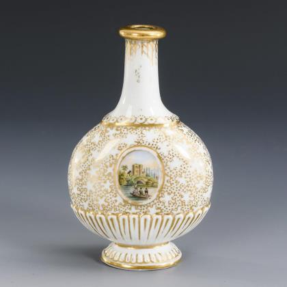 Geplattet-runder, am Ansatz zungenbandreliefierter Korpus mit schlankem Hals und zungenbandreliefiertem Fuß. Beidseitig zwei kleine Medaillons mit farbig gemalten Miniaturansichten (u.a. Dresden), reich goldstaffiert. Ohne Stopfen