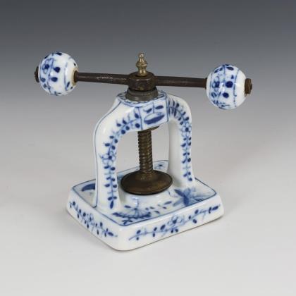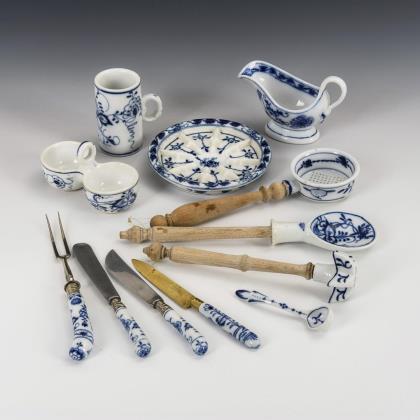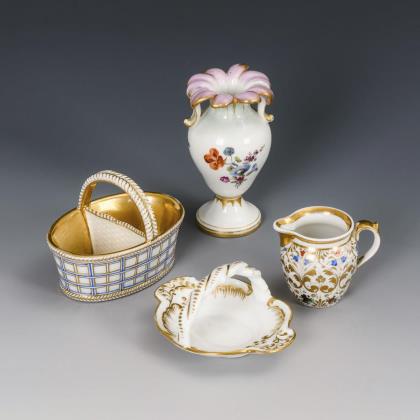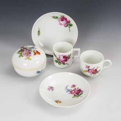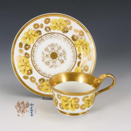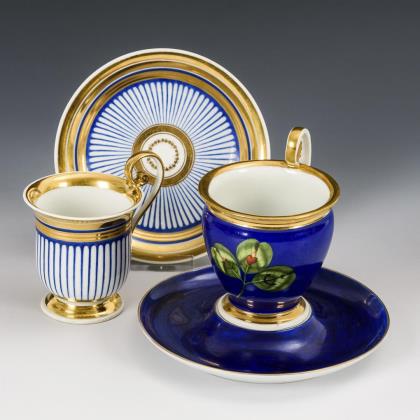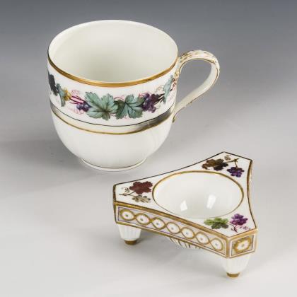 asse mit Fruchtmalerei. Ungemarkt, um 1840. Polychrom bemalt, goldstaffiert. H Tasse 7 cm, Ø ergänzte 14,5 cm. Gefußte Glockentasse mit Ohrenhenkel. Schauseitig ein goldgerahmtes Medaillon mit der Darstellung eines Stachelbeerzweiges. Partieller Goldabrieb.