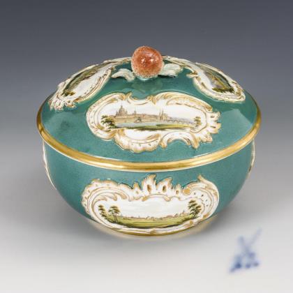 Polygonale Tasse mit Knaufdeckel. Schauseitig eine goldgerahmte Rechteckkartusche mit der unterseitig bezeichneten Ansicht der Marktkirche und des Badhauses in Hannover