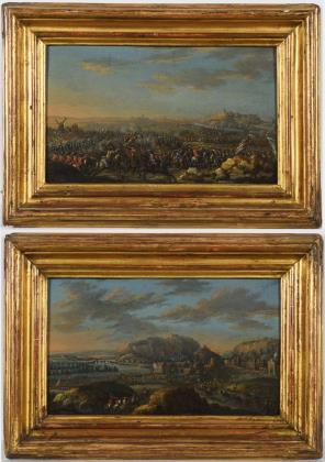 Überaus feine monochrome Malerei. Sehr detailreich ausgeführte, figurenreiche Genreszene mit Blick auf eine Stadtansicht. Ohne Rahmen