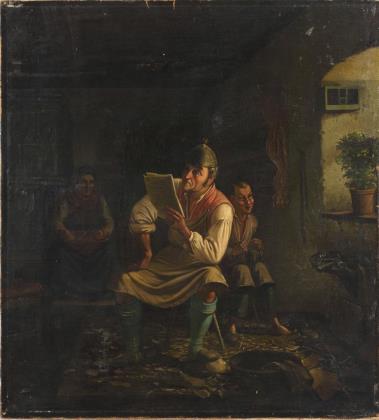 Porträts eines Mannes beim Putzen der Stiefel; Bildnis eines Mannes mit Pfeife und Porträt einer jungen Zigeunerin. Altersspuren.