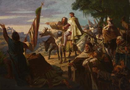 Monogramist "H.J.": Historicist scene with crusaders on a cliff near Jerusalem