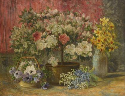 LOBEDAN, Clara(1840 Naumburg - 1918 Berlin) Stillleben Öl/Leinwand. Links signiert. Datiert: 1912. 66 x 86 cm. Gerahmt : 80 x 100 cm. Herrlich blühende Pflanzen in Korb, Topf und Flasche. Blumen- und Stilllebenmalerin und Keramikerin in Berlin, Schülerin von Th. Grönland und Gussow. Literatur : Thieme/Becker.