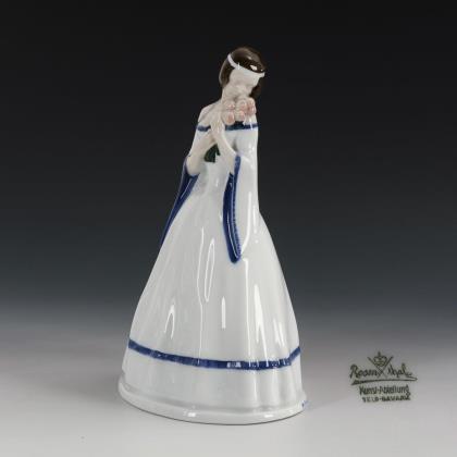 Standing Biedermeier girl with a barge hat and a bouquet of flowers. Viennese manufacture Friedrich Goldscheider.