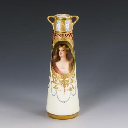 Pair of Art Nouveau fireplace vases with motifs after Angelika Kauffmann. Marlborough Pottery Co, Hanley/Stoke-on-Trent.