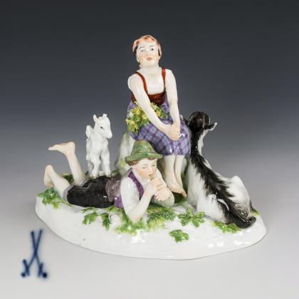 Kinderpaar als Ziegenhirten mit Ziege und Zicklein