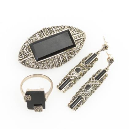 3 pieces onyx jewelry with marcasites