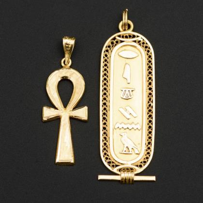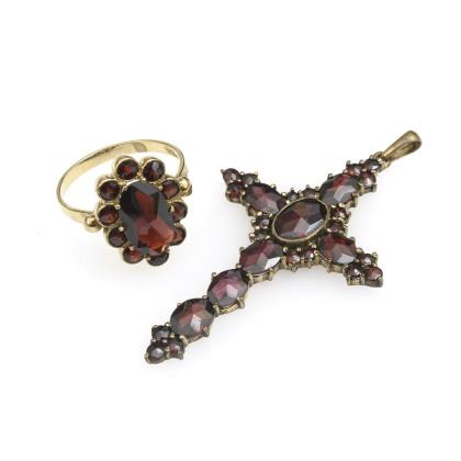 Cross pendant and ring with garnets