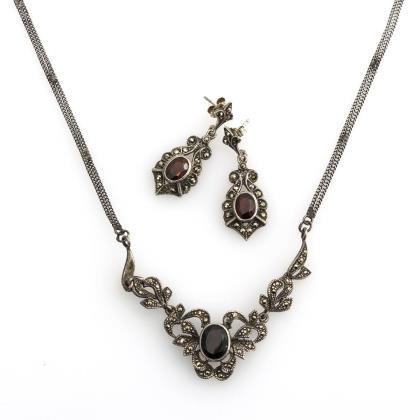 Marcasite necklace and pair of earrings with garnets