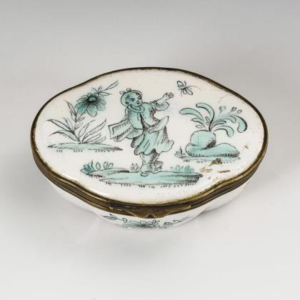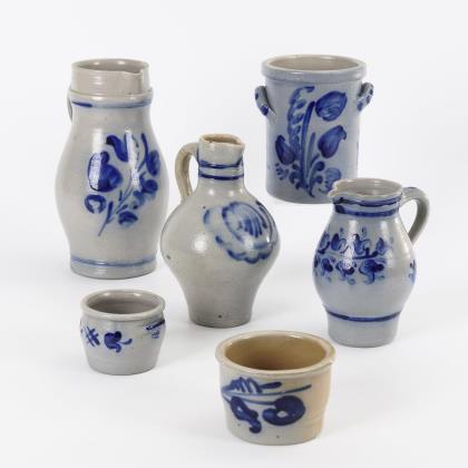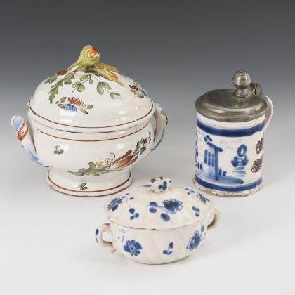 Kleiner Walzenkrug mit Zinndeckel, blau und manganviolett bemalt mit schauseitiger Architektur (H 11,5 cm). Runde Terrine mit polychromer Blumenmalerei, Deckel mit teilplastischem Fruchtknauf (H 15 cm). Ovales Döschen mit quergerillter Wandung und 2 Henkeln, Deckel mit Blütenknauf, florale Blaumalerei (H 7 cm, L 12,5 cm). Alters- und Gebrauchsspuren, kleinere Defekte.