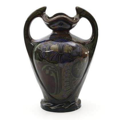 Large art nouveau baluster vase with floral painting. Gouda.