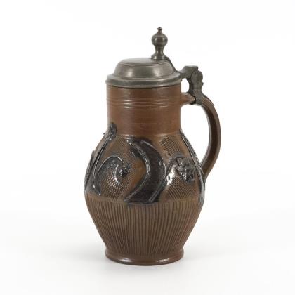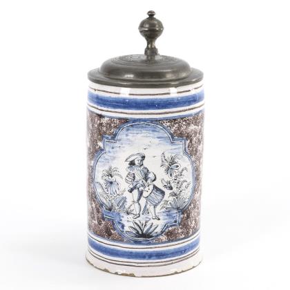 Zylinderform mit Bandhenkel. Profilierter Zinndeckel mit Reliefplakette und figürlichem Drücker, graviert "I.E.", Zinnstandring