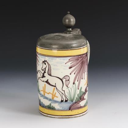 Baroque faience roller jug with jumping horse. Hannoversch-Münden.