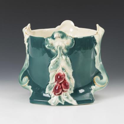 Art Nouveau cachepot with partially plastic leaf and fruit decoration. Faiencerie de Nimy.