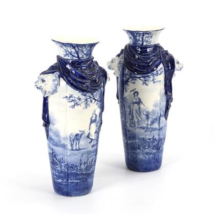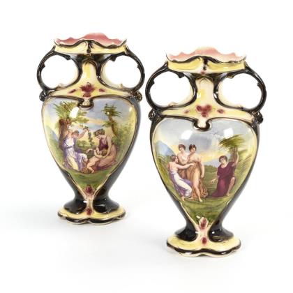 Pair of Art Nouveau fireplace vases with motifs after Angelika Kauffmann. Marlborough Pottery Co, Hanley/Stoke-on-Trent.