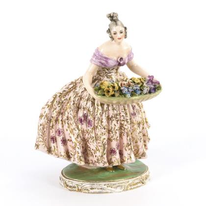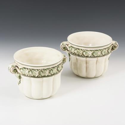 Runde, geschweifte Form mit Blütenbuketts, teils festongeschmückt. Jeweils mit Wandhalterung