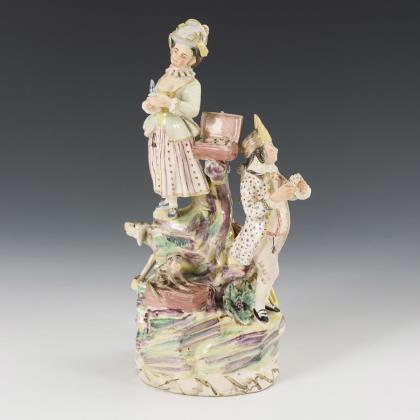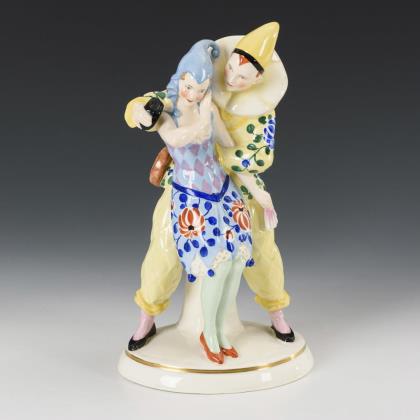 Pair of art deco figures on pedestal: Pierrot and Colombine. Hertwig, Katzhütte.