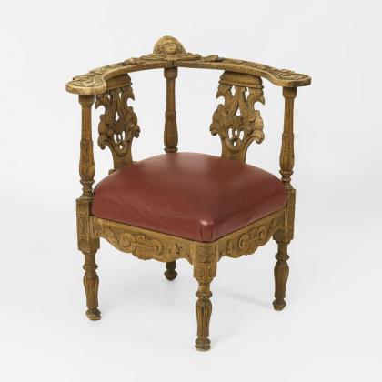 Stiltypisch geschwungenes 4-teiliges Ensemble mit Sofa, 2 Polsterstühlen und 1 Armlehnstuhl, bekrönt mit üppiger Pflanzenschnitzerei. Weinroter Samtbezug mit farbig abgesetzten Rankenornamenten. Wohnfertig restauriert, Polster und Bezug ergänzt.