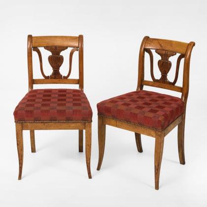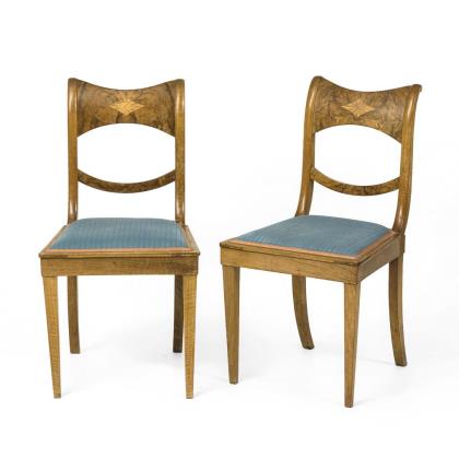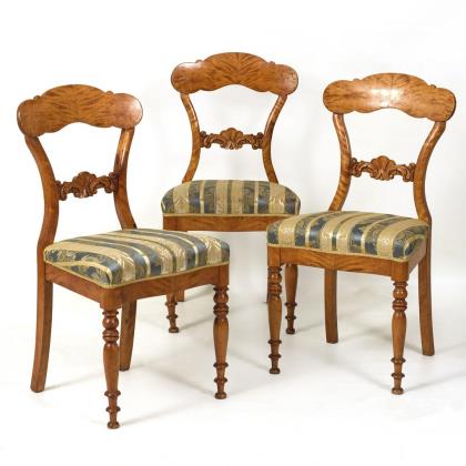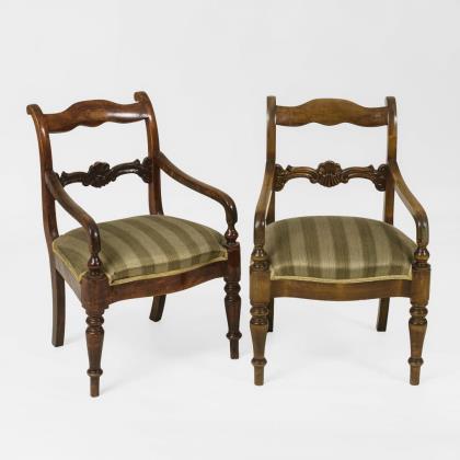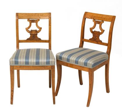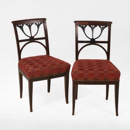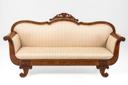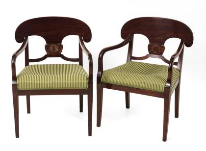 Mahagoni, massiv und furniert. Sofa 115 x 160 x 65 cm, Sitzhöhe ca. 38 cm | Armlehnstuhl H 110 cm, Sitzhöhe ca. 40 cm | Stühle H je 100 cm, Sitzhöhe je ca. 45 cm.