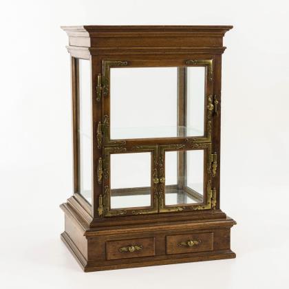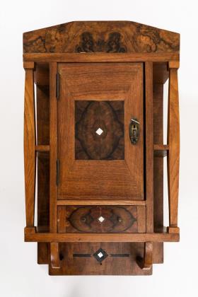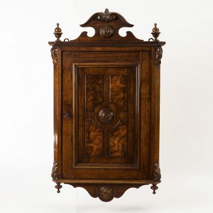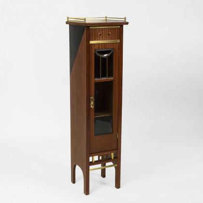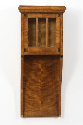 Hochrechteckiges Wandmöbel mit facettiert verglaster und senkrecht versprosster Tür, Stufensims mit Zierleiste, langes Konsolbrett mit geschwungenen Seiten, Messingbeschläge an den Ecken, Messingknauf. Leichte Alters-/Gebrauchsspuren.