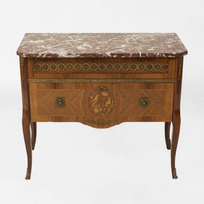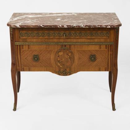 Zierlicher Schreibtisch mit Schreibklappe, in stiltypisch geschwungener Form, dekoriert mit üppigen Messing-Applikationen, Vogel- und Blumenmarketerien sowie ebonisierter Bandintarsie; innen 4 kleine Schübe und 1 offenes Fach. Alters-/Gebrauchsspuren, restauriert.