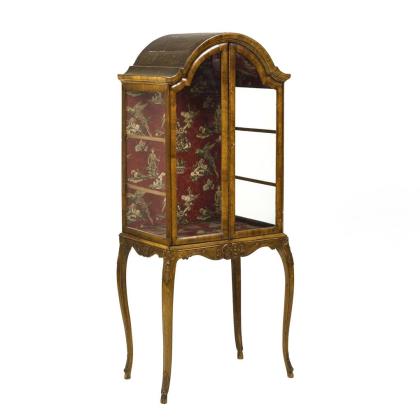Eleganter 1-türiger Vitrinenschrank in stiltypisch geschwungener Form mit verglast-versprosster Front, verziert mit feiner, goldakzentuierter Rocaillenschnitzerei; innen 3 Einlegeböden. Innenboden mit größerem Abplatzer, leichte Alters-/Gebrauchsspuren.
