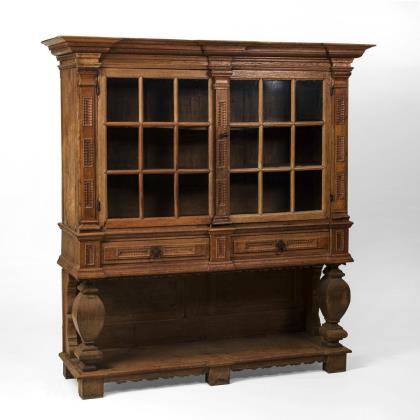 Hoher Vitrinenaufsatzschrank mit 3-türigem, kastenförmigem Unterteil und 2 Schüben (mittig ein Blenderschub), 2-türiger, ergänzter Aufsatz mit geschweiftem Giebel und Sprossenfenstern. Verziert mit kassettierten, teils geschweiften Füllungen. Vitrinenaufsatz mit 4 höhenverstellbaren Einlegeböden