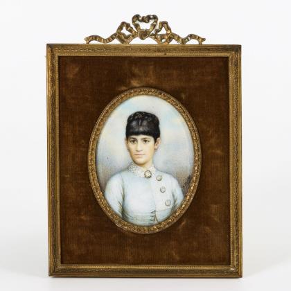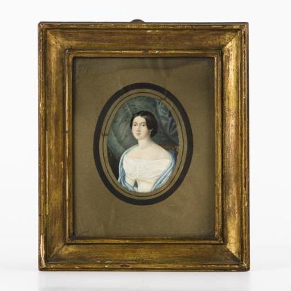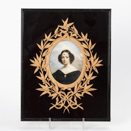 Large miniature: Portrait of a lady with artistically carved laurel frame in a glass case