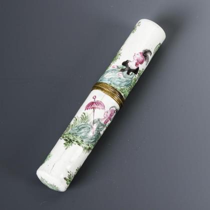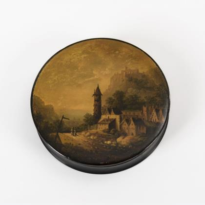 Papiermaché schwarz lackiert, Lackmalerei. H 2 cm, Ø 10,5 cm.