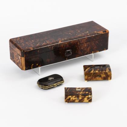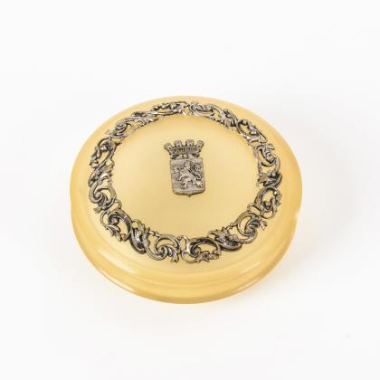 Flache Quaderdose mit Gravuren auf den leicht sphärischen Wandungen. Scharnierdeckel und Boden aus Schildpattimitat, auf dem Deckel eingelassenes Metall-Ornament in Piqué-Art mit leerem Wappenschild. Einige Alters-/Gebrauchsspuren und 1 geringer Ausbruch am Imitat.