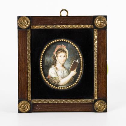 Tempera/Elfenbein, 1 Goldrahmen (14 kt Rotgold geprüft). Miniatur maximal 4,2 x 3,3 cm.