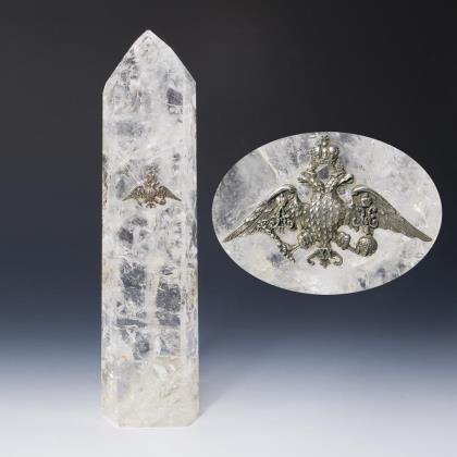 Frontal Silber-Applikation. Bekrönter russischer Doppeladler mit den Monogrammen von Zar Nikolaus II und Zar Alexander II. Plan geschliffener Boden mit altem Klebe-Etikett. 6-eckig facettierter Korpus mit pyramidenförmiger Spitze