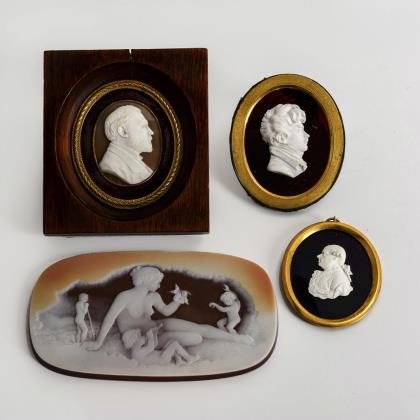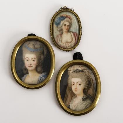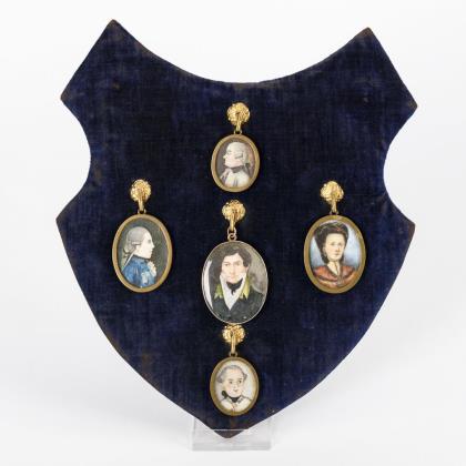 Zumindest 4 zusammengehörende Bildnisminiaturen in Messingrahmen. Beidseitig verglaster Goldrahmen mit Herrenbildnis. Teils starke Alters-/Gebrauchsspuren.