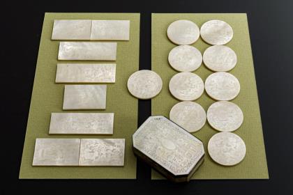 Box and 18 plates of mother of pearl with chinoiserie engravings