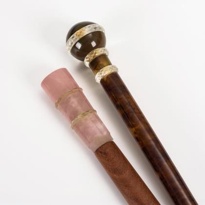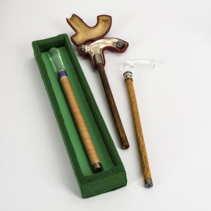 1 x mit Achatkugel in Originaletui, mit facettierten Ringen (vermutlich Bergkristall), in Originaletui.